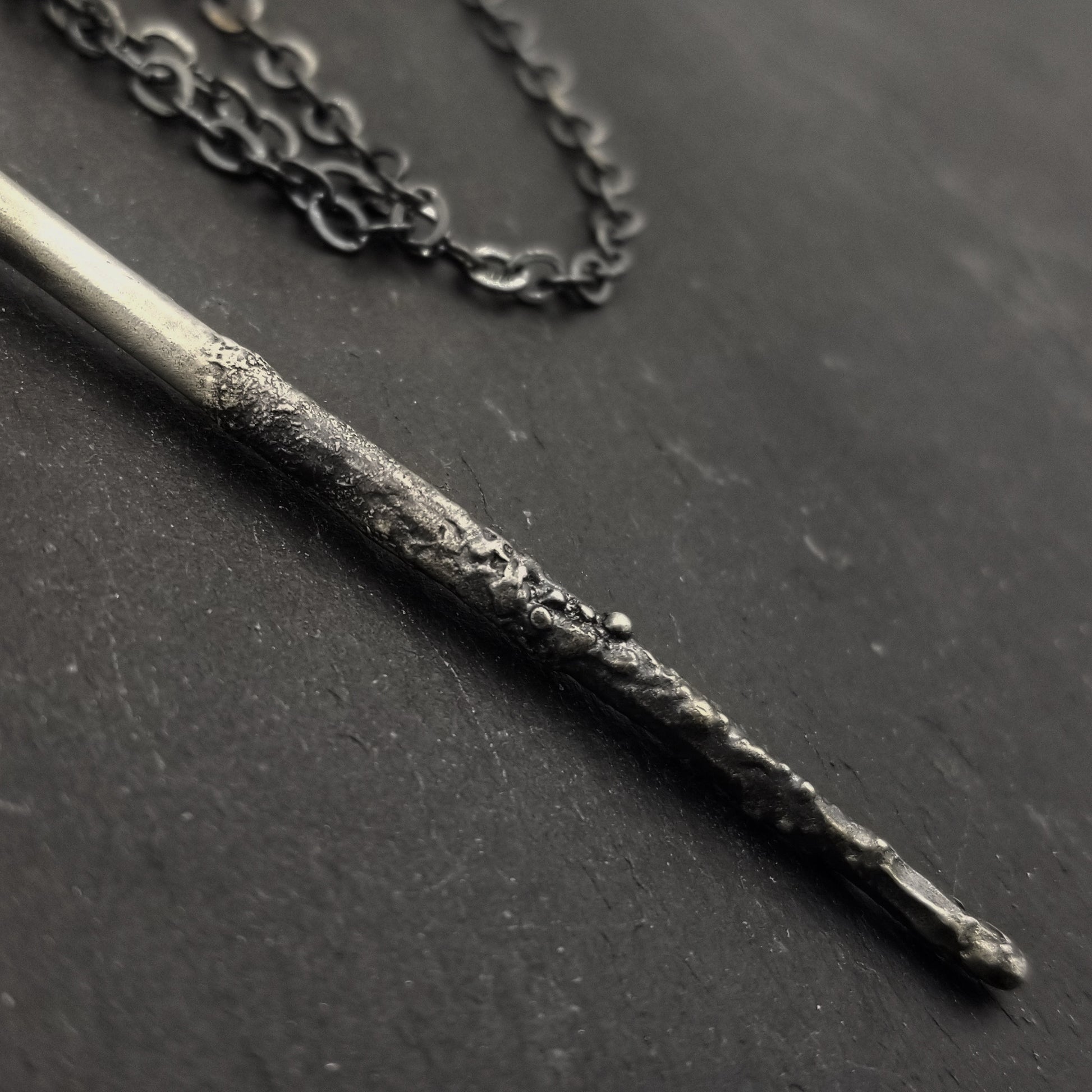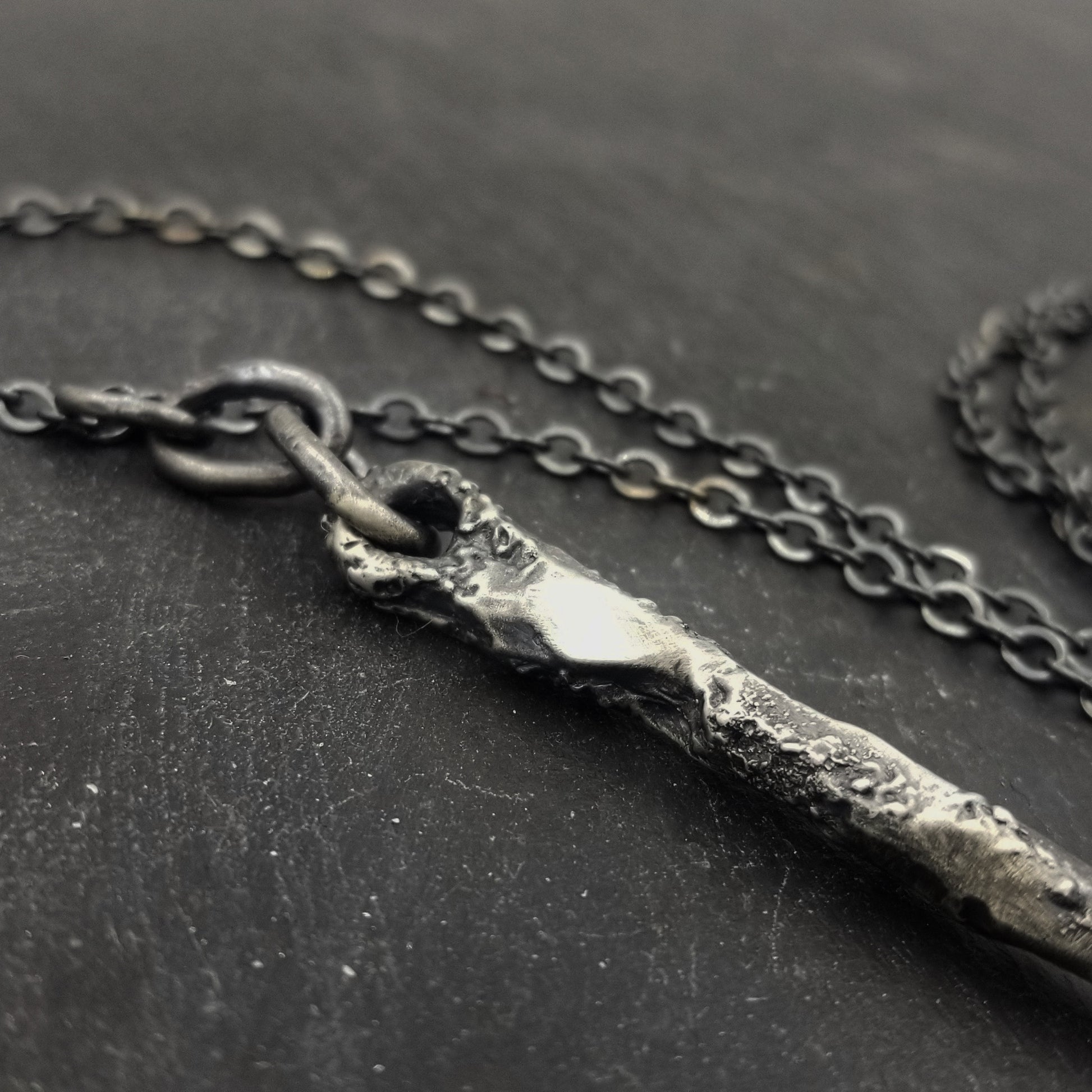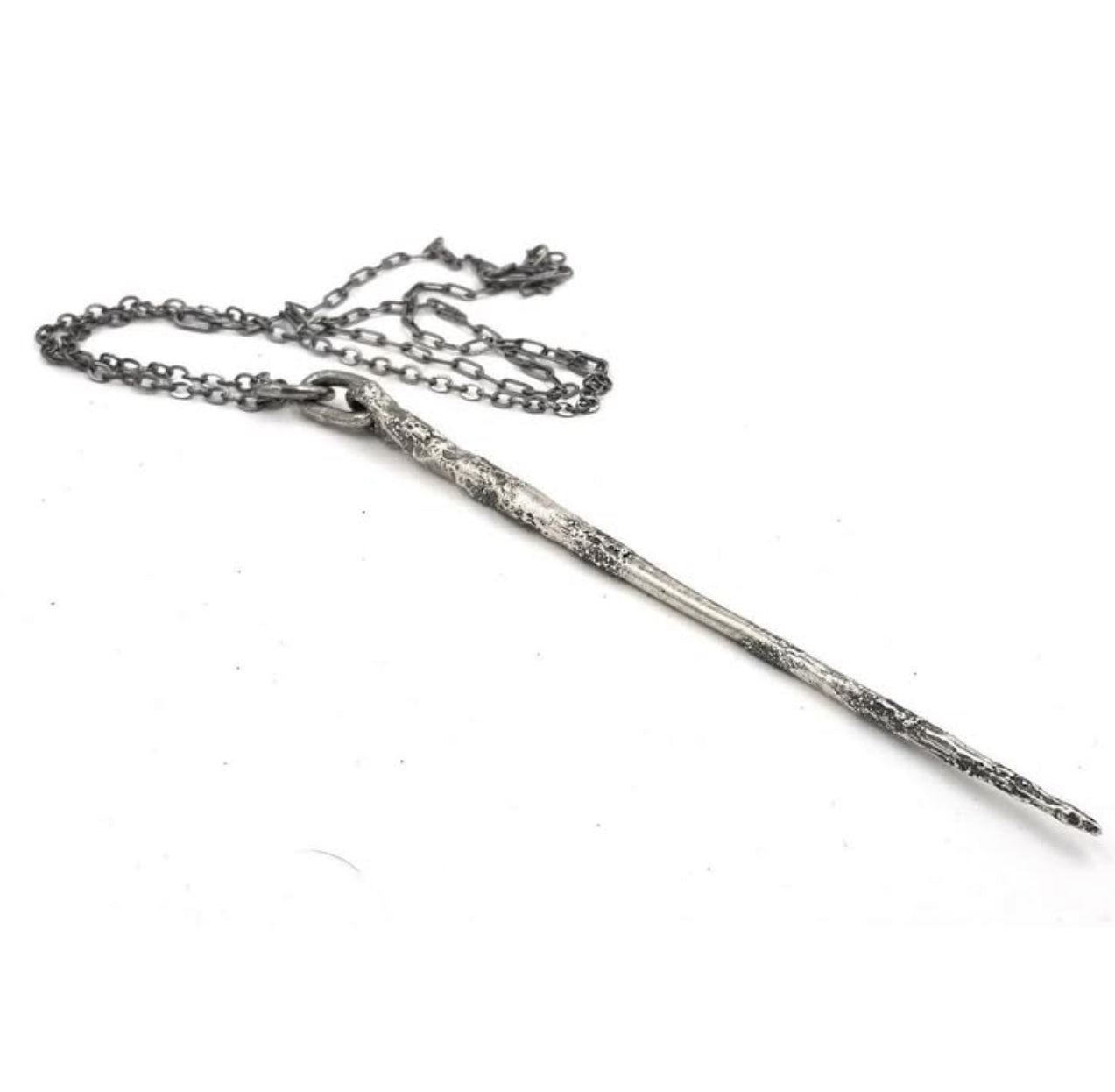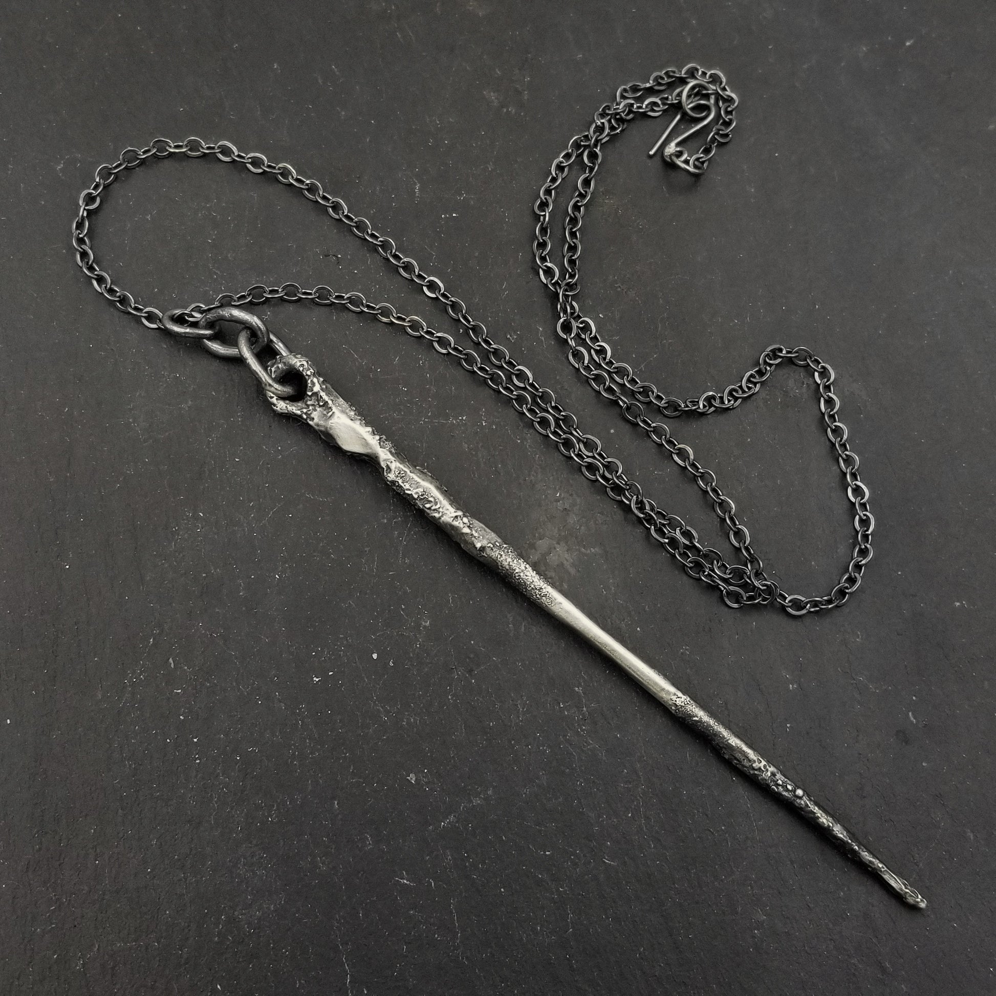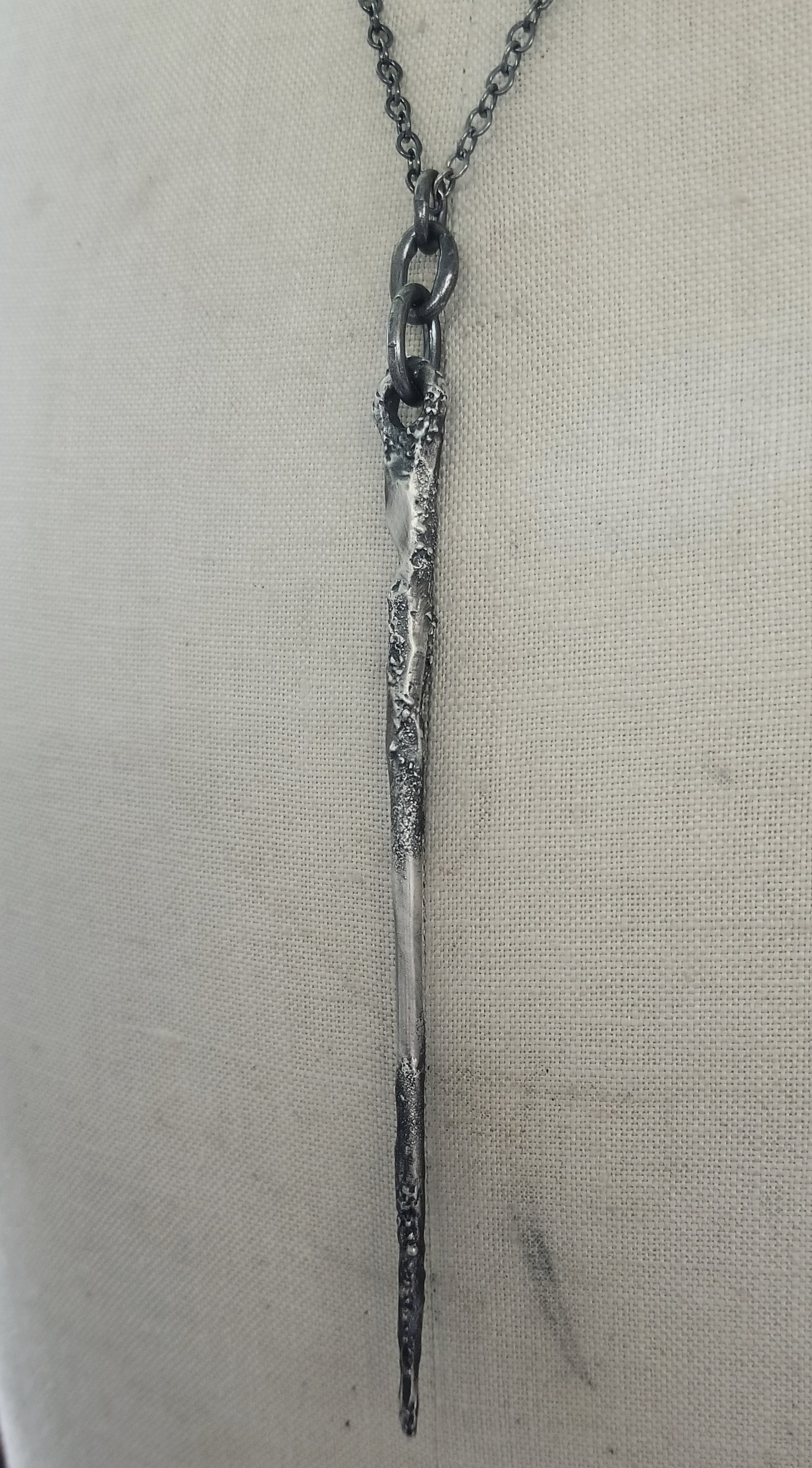 This piece is made of a mix of ancient bronze and sterling silver and is hung from a sterling silver 26” link chain with handmade clasp. Pendant measures approximately 5.5” in length