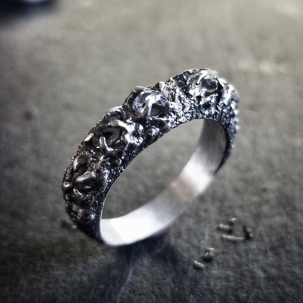 hand carved sterling silver band with 5 herkimer stones in claw settings
