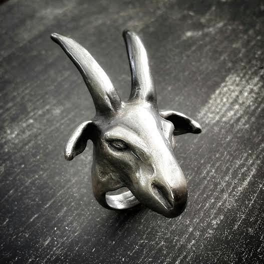 This ring is not for the faint of heart. The Scapegoat Ring is a hefty 1.5 ounces of sterling silver and measures 2.5 inches long. Please note that due to the nature of oxidation the finish of each ring may slightly vary. Darkened/oxidized silver will become brighter and shiner with wear, especially on the raised portions of the piece.